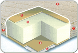 1. Merinói gyapjú (100%) fekvőfelület – téli oldal2. Csúszásgátló, légáteresztő, gumírozott réteg (habosított)3. Eliocell-latex mag4. Csúszásgátló, légáteresztő, gumírozott